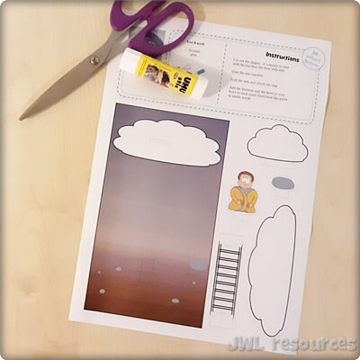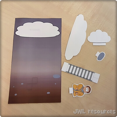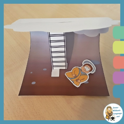 This Jacob’s Ladder paper craft scene with it’s curved sky and layered clouds allows the child to look at the image from various angles. Peering down through the clouds from heaven or up from the ground through Jacob’s eyes.