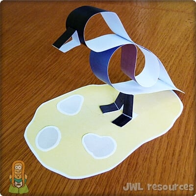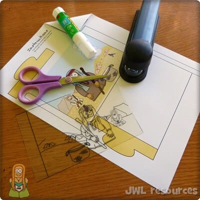 To make this craft, you will need the 2-page template printout (one page printed on paper, the other on acetate), scissors, some paper glue, and a black pen. I’d also recommend a stapler.