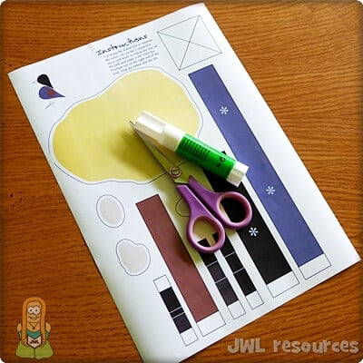 To make this craft, you will need the 1-page template printout, scissors, and some paper glue.
