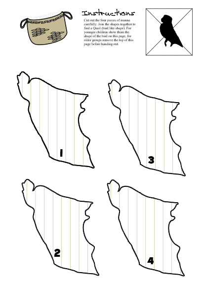 Click on the image to download the PDF of this activity. Cut out then hand out the odd shaped manna pieces. Get the kids to make groups greater than 4. The challenge is to join the pieces together to make a quail (the bird shape appears in the gap between 4 pieces). Talk about how God gave the people food when there was no natural source for them in the desert.