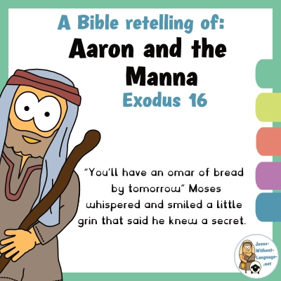 Moses told Aaron that the people should gather an omar each (a little more than 2 litres or 9 cups) and that none should be stored overnight. He quickly passed the message around as the children started to munch on the small white seed-like pieces. Aaron loved the manna, it was like honey wafers. Aaron put men in charge of weighing the amounts everyone gathered to make sure each had an omar. The men soon came back to tell Aaron their job was not needed, for those who gathered little and those who gathered a lot both had an omar. When the sun rose high, any manna left melted into the sand.
