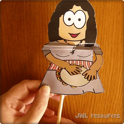 You can stop here if not making the puppet Hold the head in one hand and the skirt in the other and push and pull gently to see the hands move and the timbrel tapped as she celebrates crossing the Red Sea.