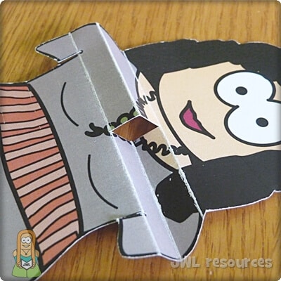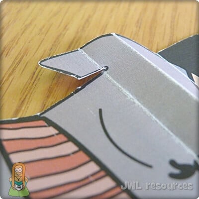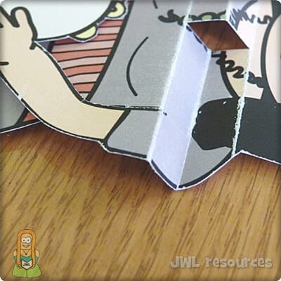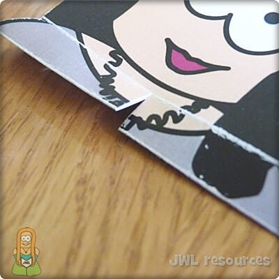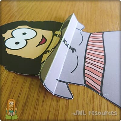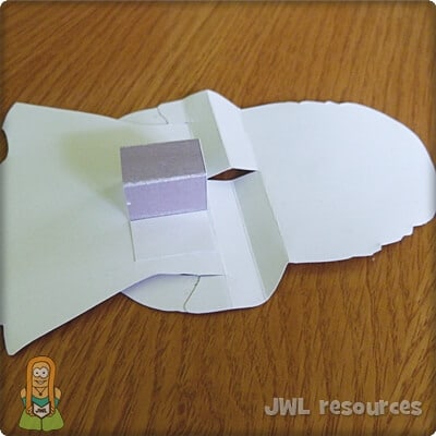 Fold and glue the guide tab on the back of Miriam slightly to one side so you miss the middle split line.