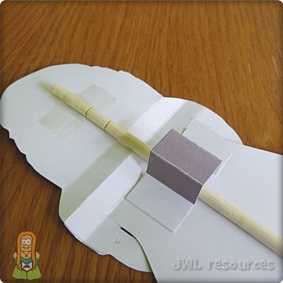 Insert the skewer, stick, or straw through the guide tab and tape onto Miriam’s head.