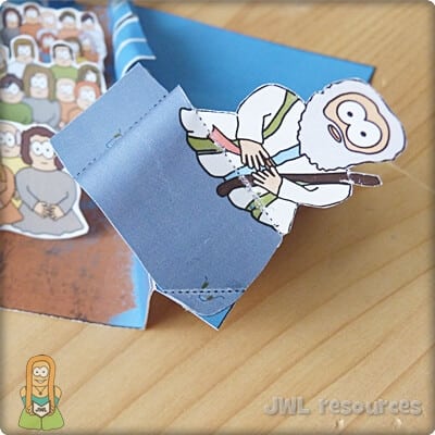 The story of the parting of the Red Sea is so very visual, it’s difficult to resist the urge to curl paper and dive into creating a scene. This version has the depth that’s needed without the hundred strips of paper, so it shouldn’t flatten too easy on the trip home. Miriam heads up the crowd while Moses stands aloof, on a classic overhanging rock, watching the crowd move. While there is quite a bit of cutting, it’s simple to put together.