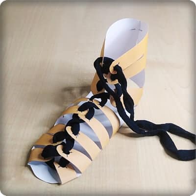 This is a modification of a Roman sandal craft I saw in a shop, I snuck a quick photo of the concept and then had a long play with prototypes before settling on this! It comes out about the size of my hand and looks really convincing. PDF is here