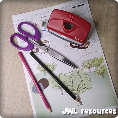 To make this craft, you will need the 1-page template printout, scissors, a hole punch and some sticks or pencils.