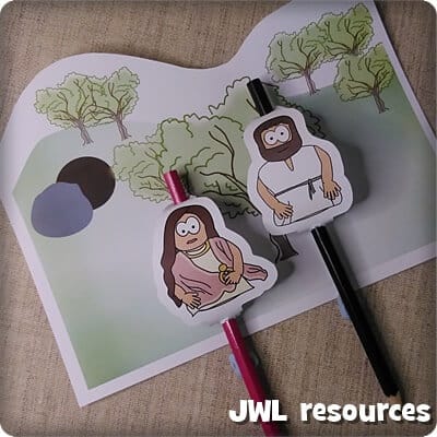 This Easter morning craft with Mary Magdalene and Jesus is a perfect candidate for the craft bags, unsupervised table, tight-on-time activity that often gets requested at Easter events. The two little pencil puppets / pencil toppers have a tiny background to act our the scene of joy and wonder that took place in the garden all those years ago.