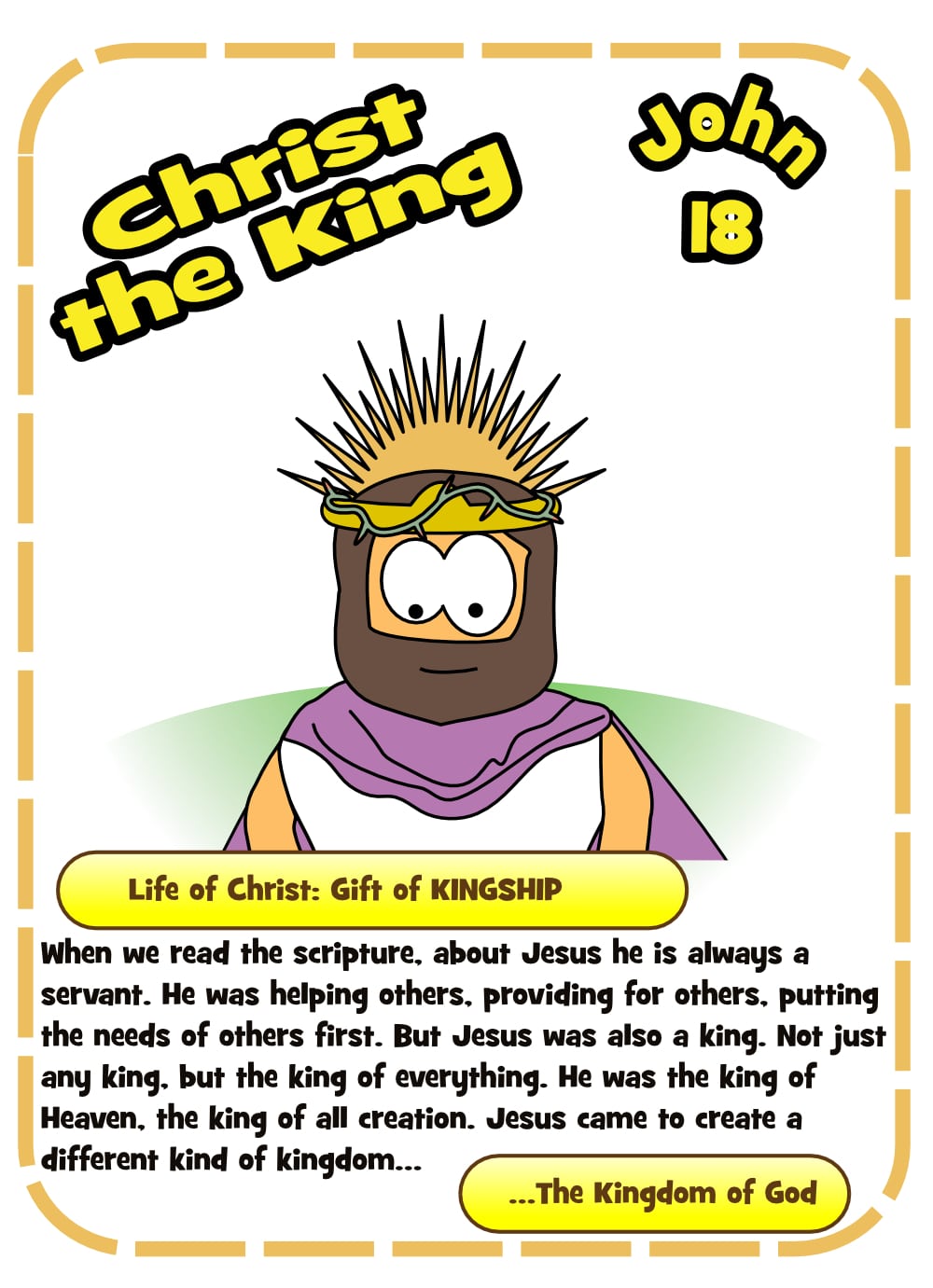 Kingship is quite a simple concept to describe to children on one level. It’s the idea that one person has the authority to make decisions for others. Like so many things, Jesus turns this Kingship idea on its head. By the time we reach the passage with Pilate, it certainly doesn’t feel like a very kingly setting. Jesus is seen at one of the weakest moments, he’s arrested, questioned like a criminal, and about to be sentenced to die by the brutal execution process of crucifixion. It may seem tempting to act out this passage, but playing the role of one who thought they had authority over Jesus, or Jesus himself, is a lot for anyone to take on. These games skit the passage, look at it sideways and spark conversations.