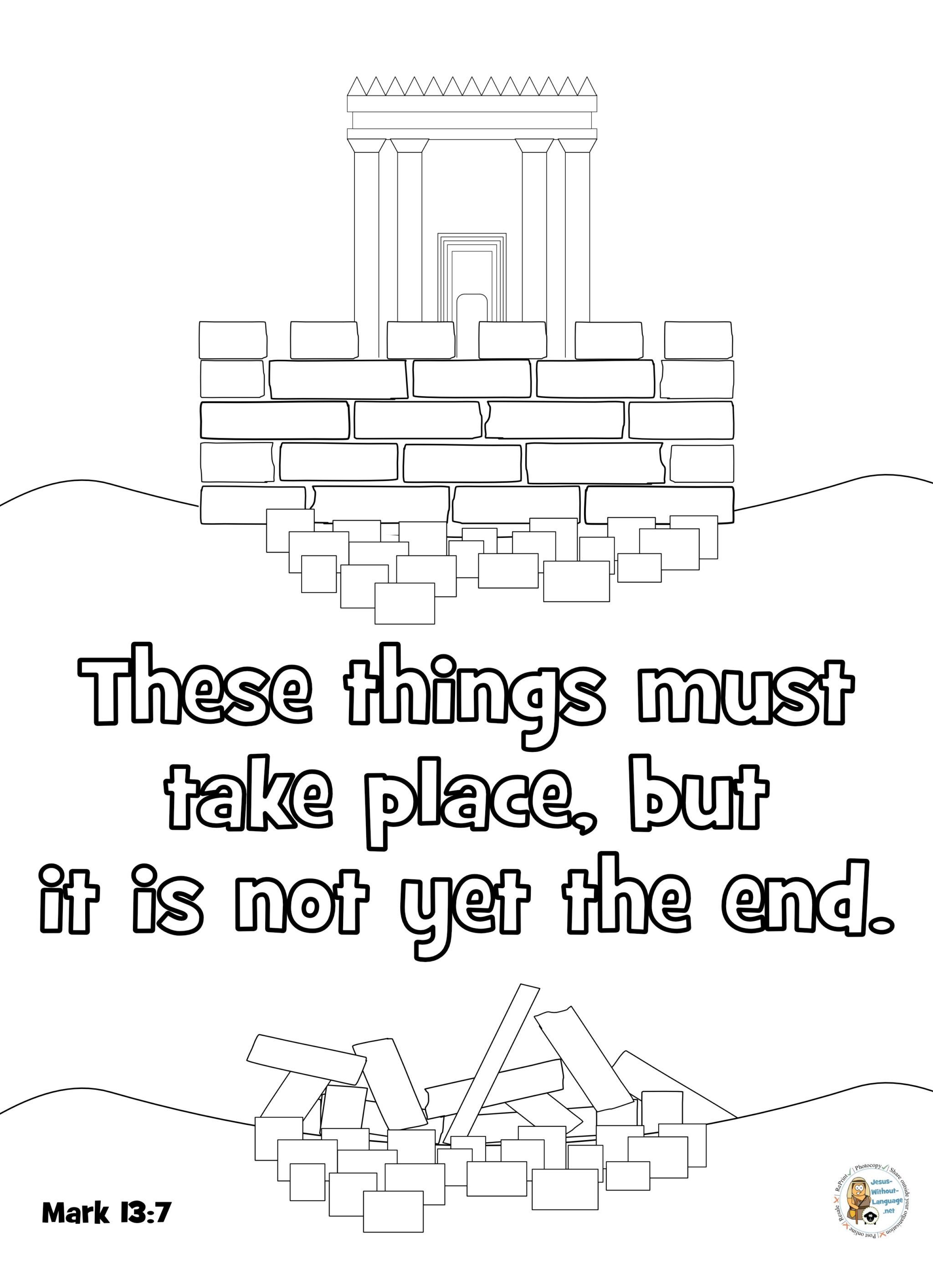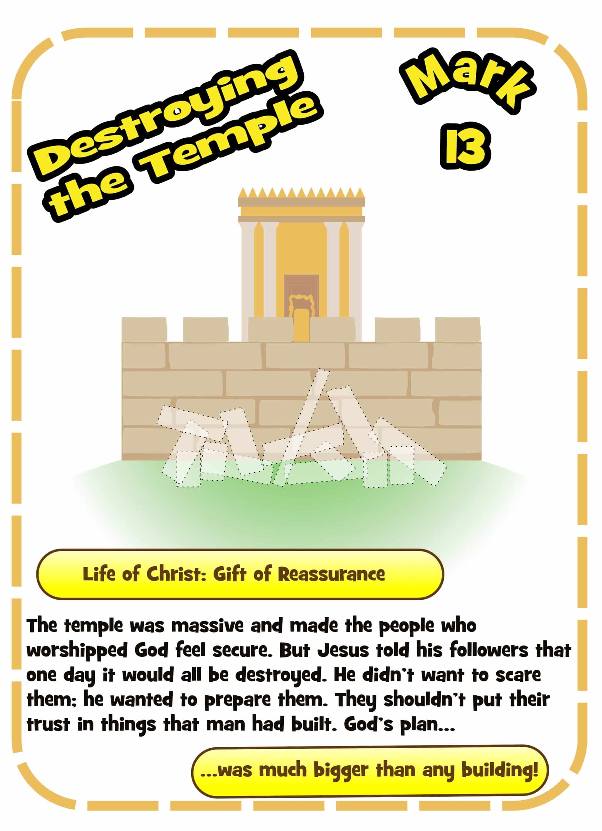 This is such a gloomy passage, and it may seem like one you’d prefer to skip, but it’s a passage that covers one of the central themes of Jesus’s ministry and making God your foundation. While the parable of the wise and foolish builder may be more visually friendly, the prediction about the fall of the temple reminds children that no matter how huge and real and solid something is, God is always bigger. In a world where the unthinkable happens, where violence seems to win, where nature destroys and empires fall, this passage offers comfort.