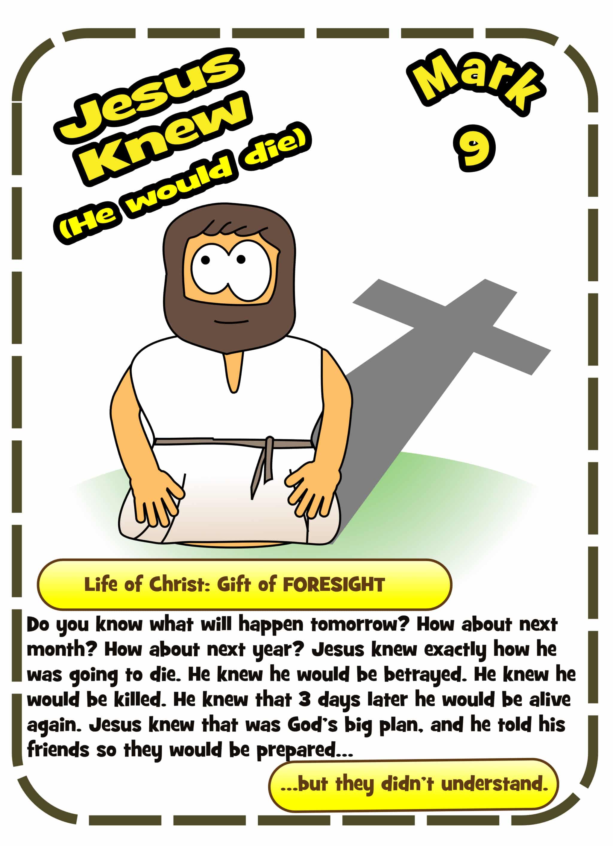 Jesus knew he would die, scripture shows he tried to tell his friends, but they couldn’t understand him. This split pin (brad) craft shows the predictions Jesus made, accompanied by the startled faces of the disciples.