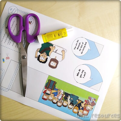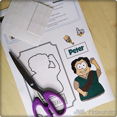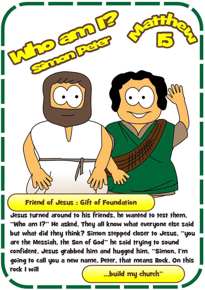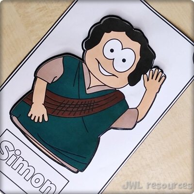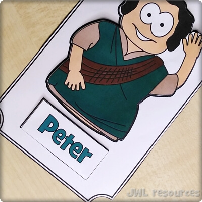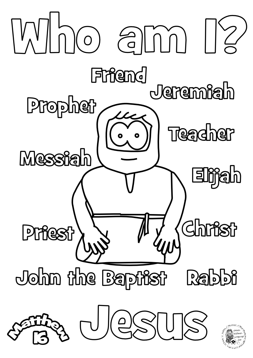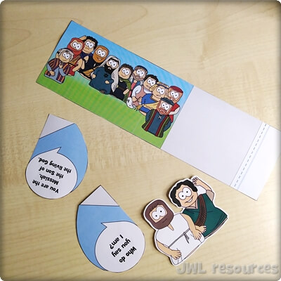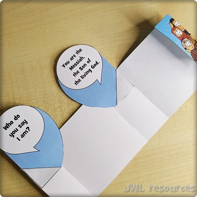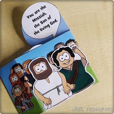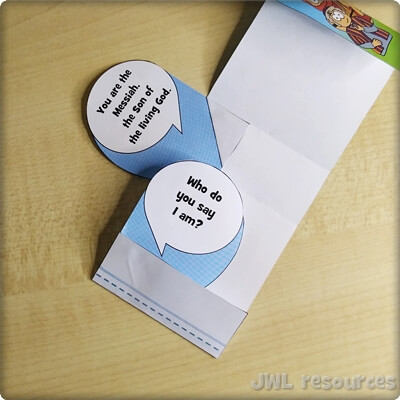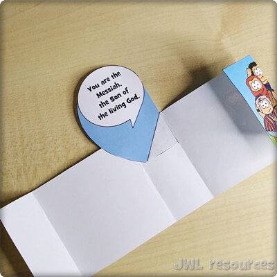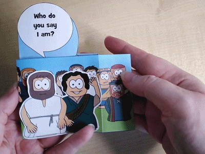 The passage rotates around a simple question and answer. Jesus asks his followers, and Simon-Peter answers. This sliding mechanism is a firm favourite, once you’ve figured out how to add the tabs it’s quick and suits groups that want to colour their own well.