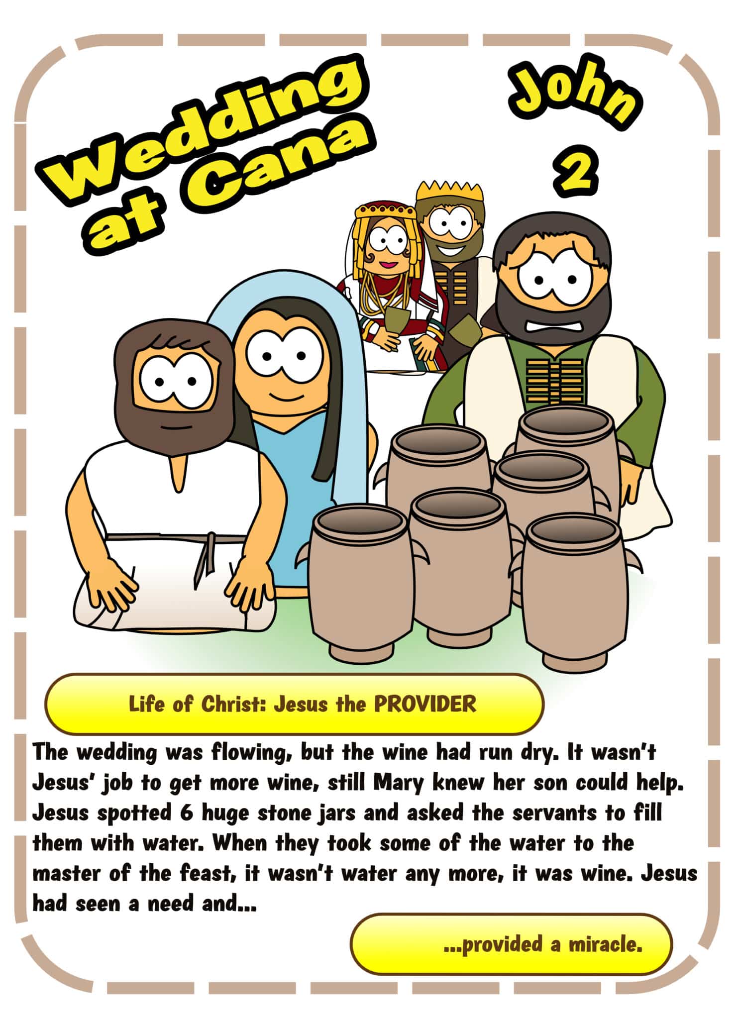 Notes: I’ve chosen to make this wedding that of James, perhaps even Jesus’s brother James? There are two versions of this story, the version used in the pack and the original longer version.