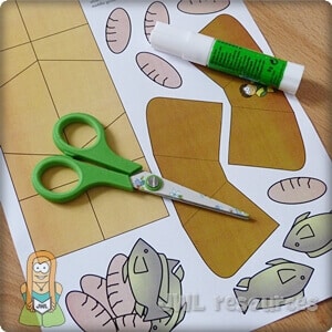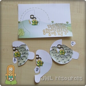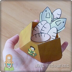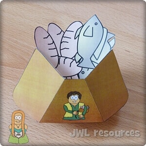 This is a beautiful little illustration that you can teach your kids, a sort of magic trick they can try out with their friends. Take a bowl or basket and place in some food to represent the loaves and fishes, crackers work well. Place a napkin over the food and then lay out 5 pieces to represent loaves and 2 fishes too. Show the children the finished setup, saying the lunch looks small but the boy was willing to share. Mimic Jesus by holding up one cracker or other food item and breaking it in half, you’ll probably get crumbs breaking off. Grab the napkin to clean up your crumbs then get the kids to look in the bowl again. Let the children try it out.