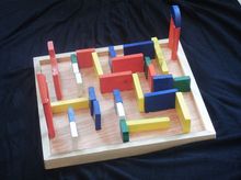 I have some very little ones in my group and so I’m trying to put more younger crafts on for them. this one is very simple and reusable. I bought a cheap wooden block set from what the locals call a ‘Chinese’ shop and using sticky tack I made a maze for the kids to solve. They can use a finger to trace the route or a toy person, or a block with a picture attached with glue. Once solved you can let the children destroy it and make a picture of the house that Peter was looking for out of the blocks. |