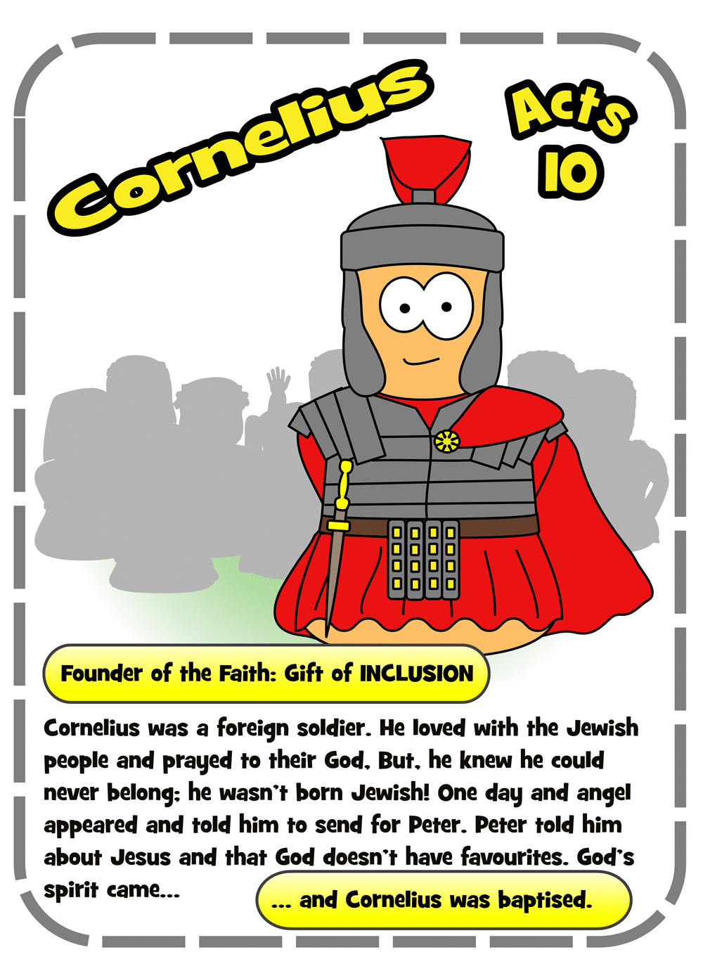 These are the Character resources provided for: Cornelius (Acts 10)’ – where Peter welcomes gentiles into the faith.