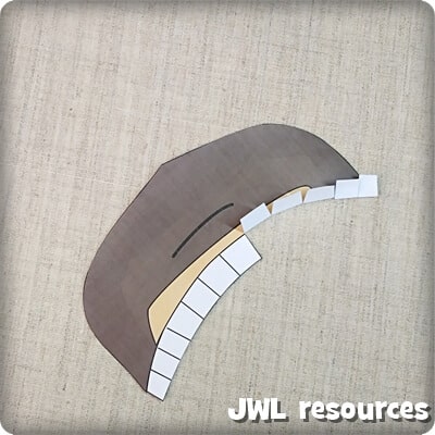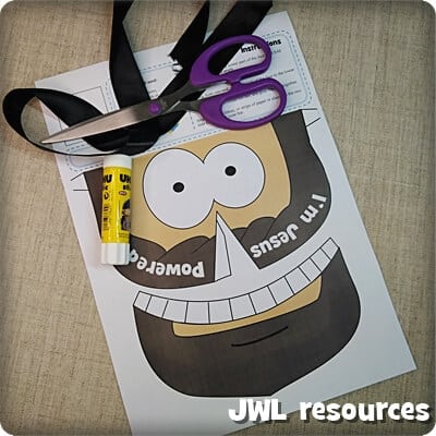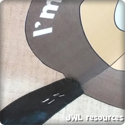 To make this craft you will need the 1 page template printout, scissors, glue and ribbon/string paper strips, to go around the head.