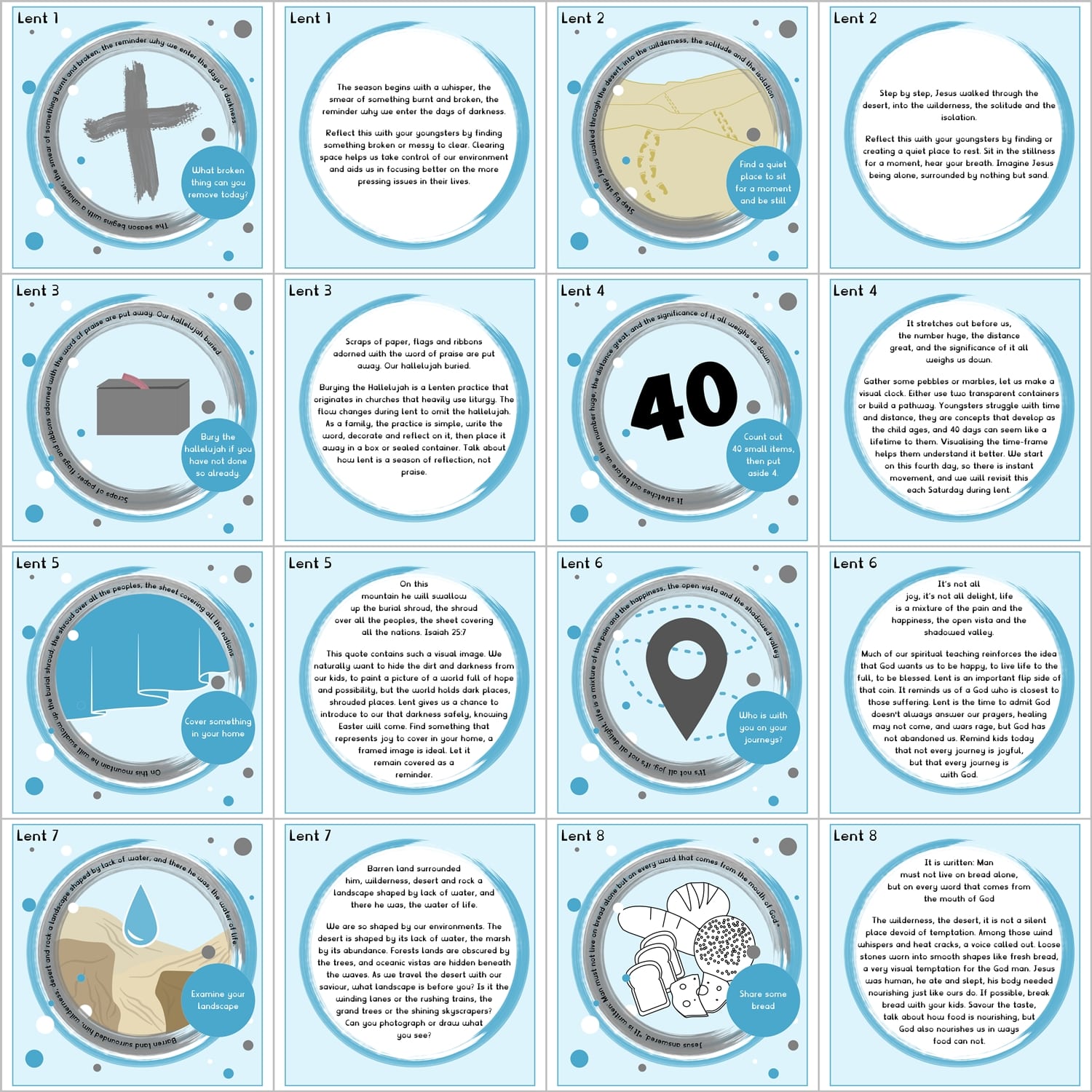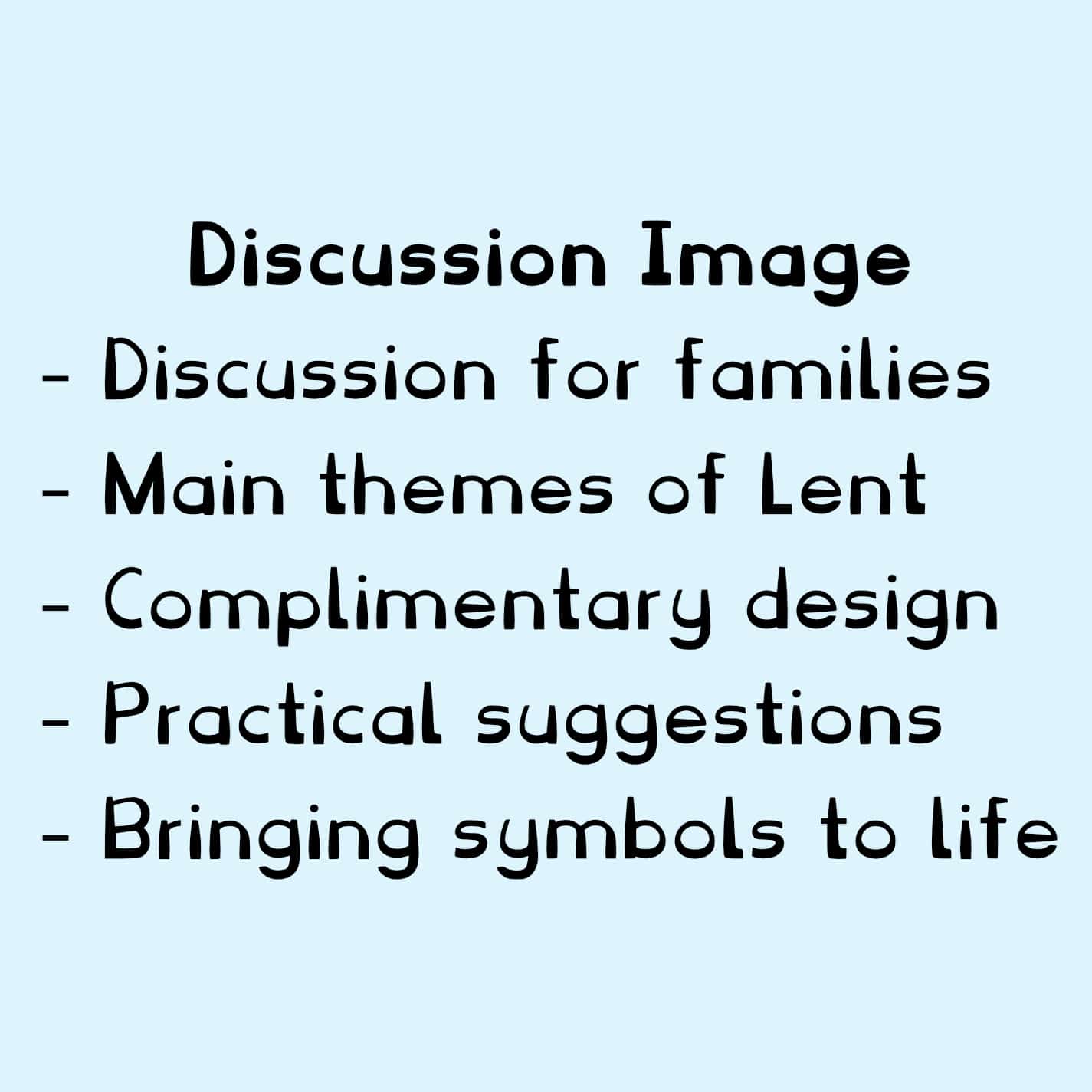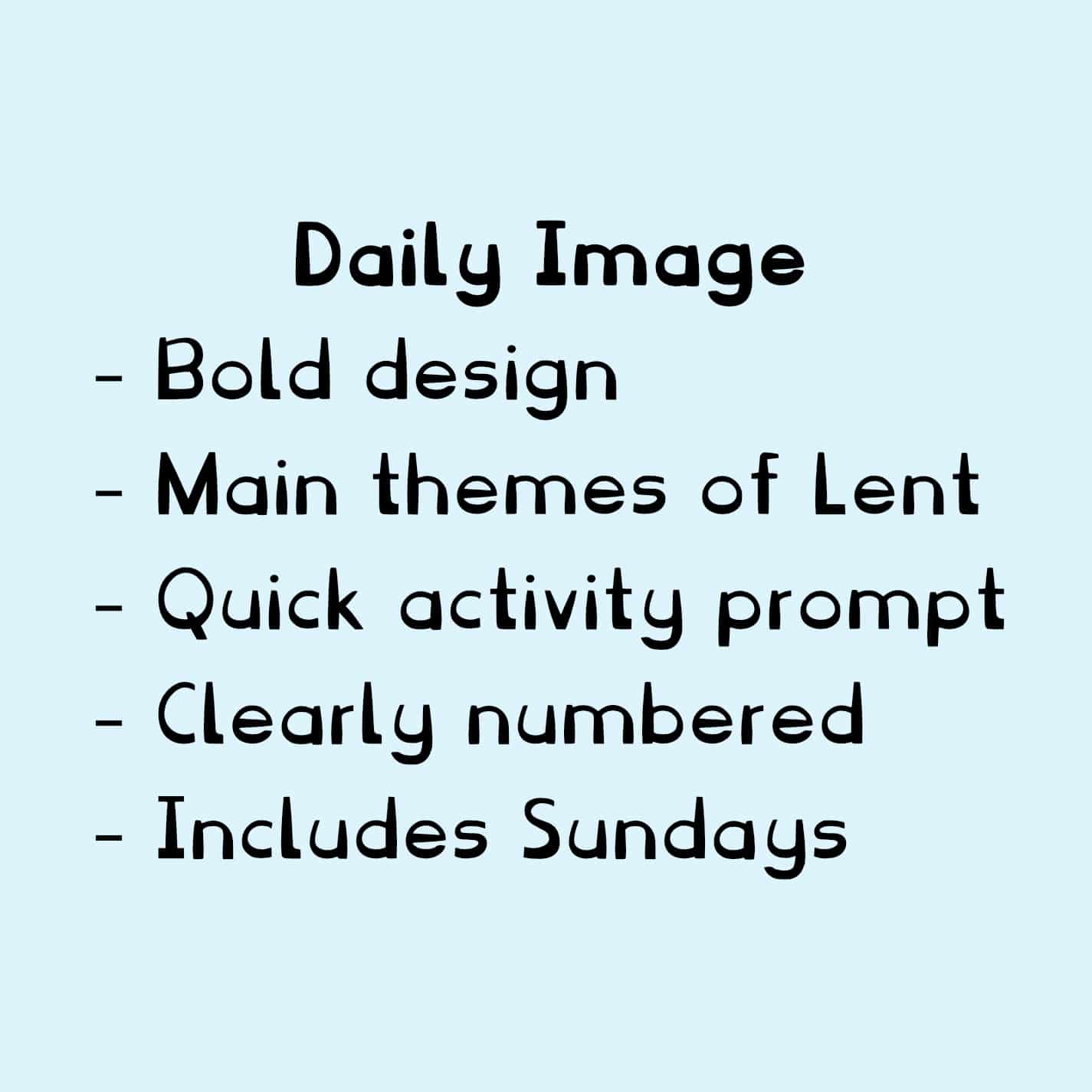 Each day comes with 2 numbered images, a bold graphic design and a discussion text. Each includes “hands-on” suggestions. Saturdays recognise the big countdowns, while there are extra optional graphics for each Sunday’s pause, and one for Easter day too.