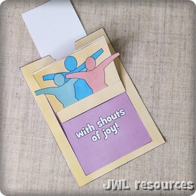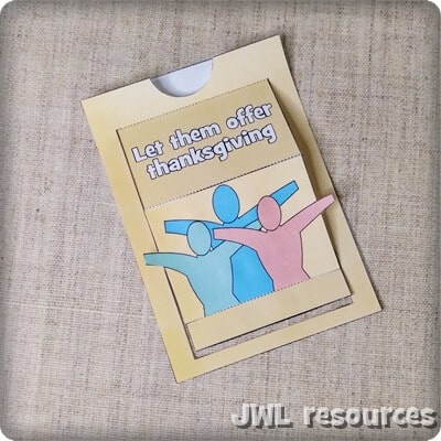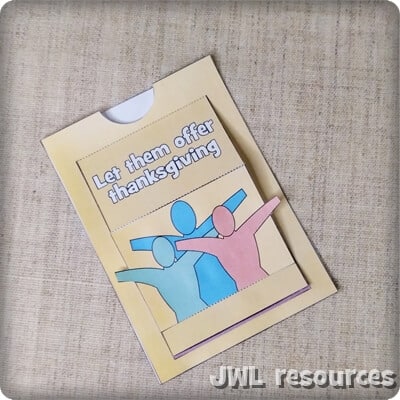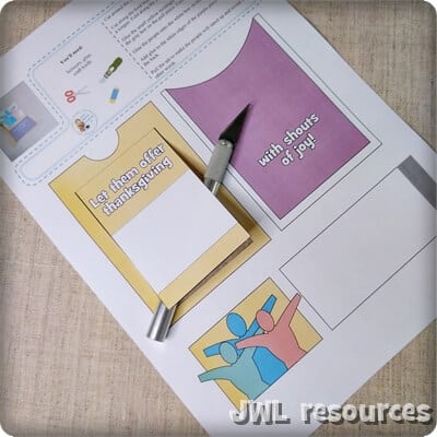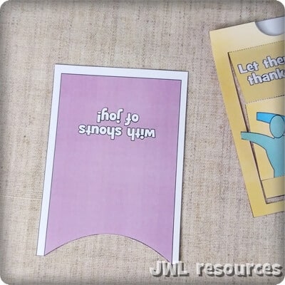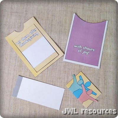This is a small moving papercraft based on Psalm 107 verse 22 “Let them offer thanksgiving sacrifices and announce his works with shouts of joy.” This is a little mechanism papercraft that opens to reveal the end of the verse and see the people lift up in their ‘shouts of joy’.