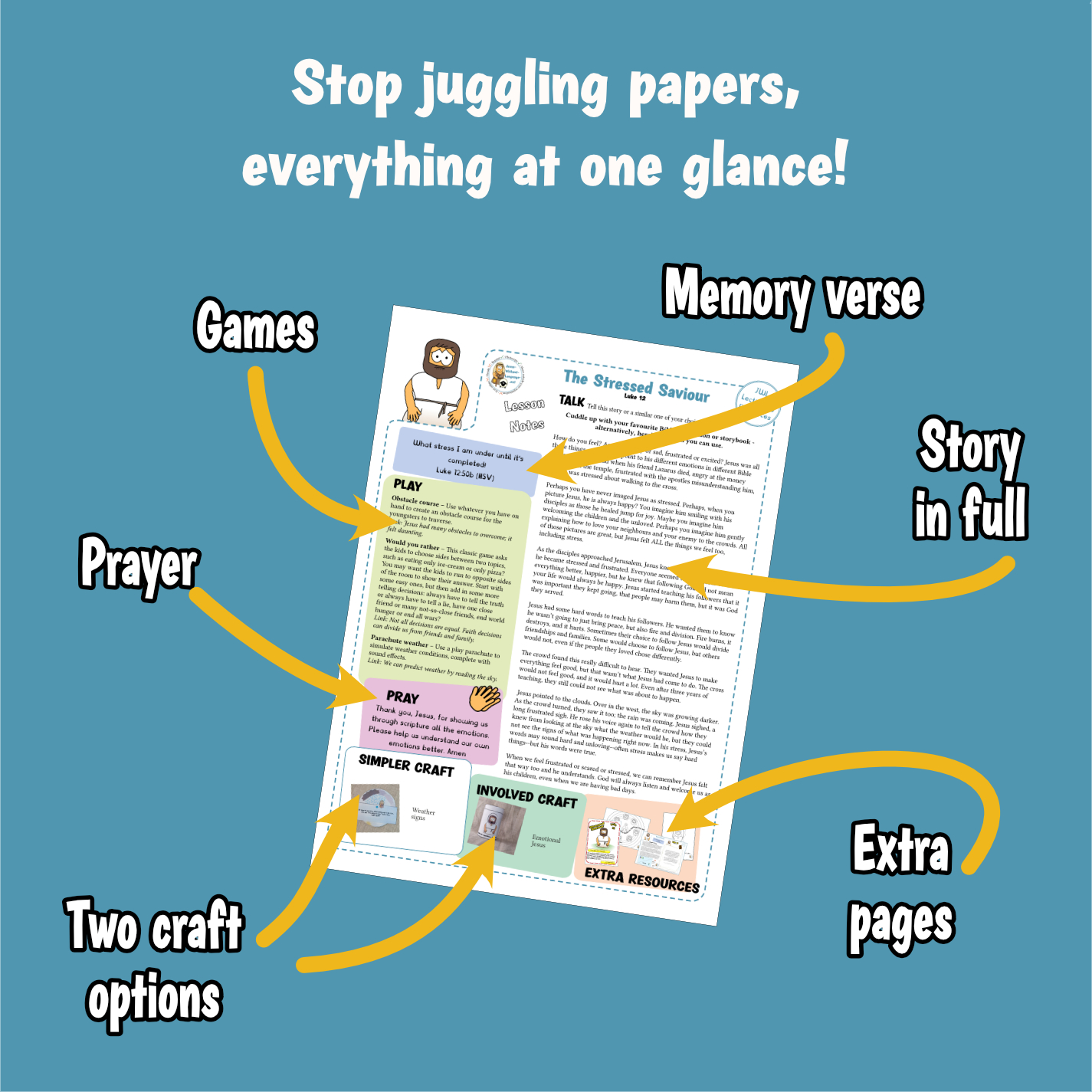Kids ministry lesson on the passage in Luke 12 where Jesus appears to be stressed and starts talking about casting fire and dividing families. The pack focuses on emotions, how following Jesus can be divisive, and how faith does not guarantee an easy ride. This pack is perfect for a short kids Sunday school session. A great lesson to use in the home, church, or classroom setting.