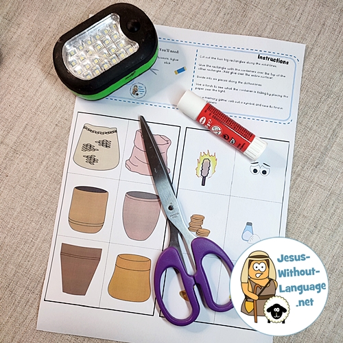 The idea of hiding things inside containers and the light shining through is a beautiful visual this craft plays on. It’s partly a craft and partly a memory game. If you have a very young group, make the whole thing in advance and just search inside. An older group can play a speed game where someone calls out a symbol, and they race to find it in their containers.