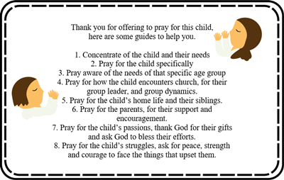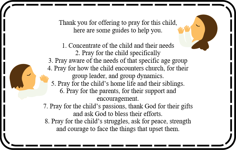 Pray for their contact with church. the group they are part of – it’s group dynamic and the leaders who serve. Pray for the groups needs and how they may influence the child.