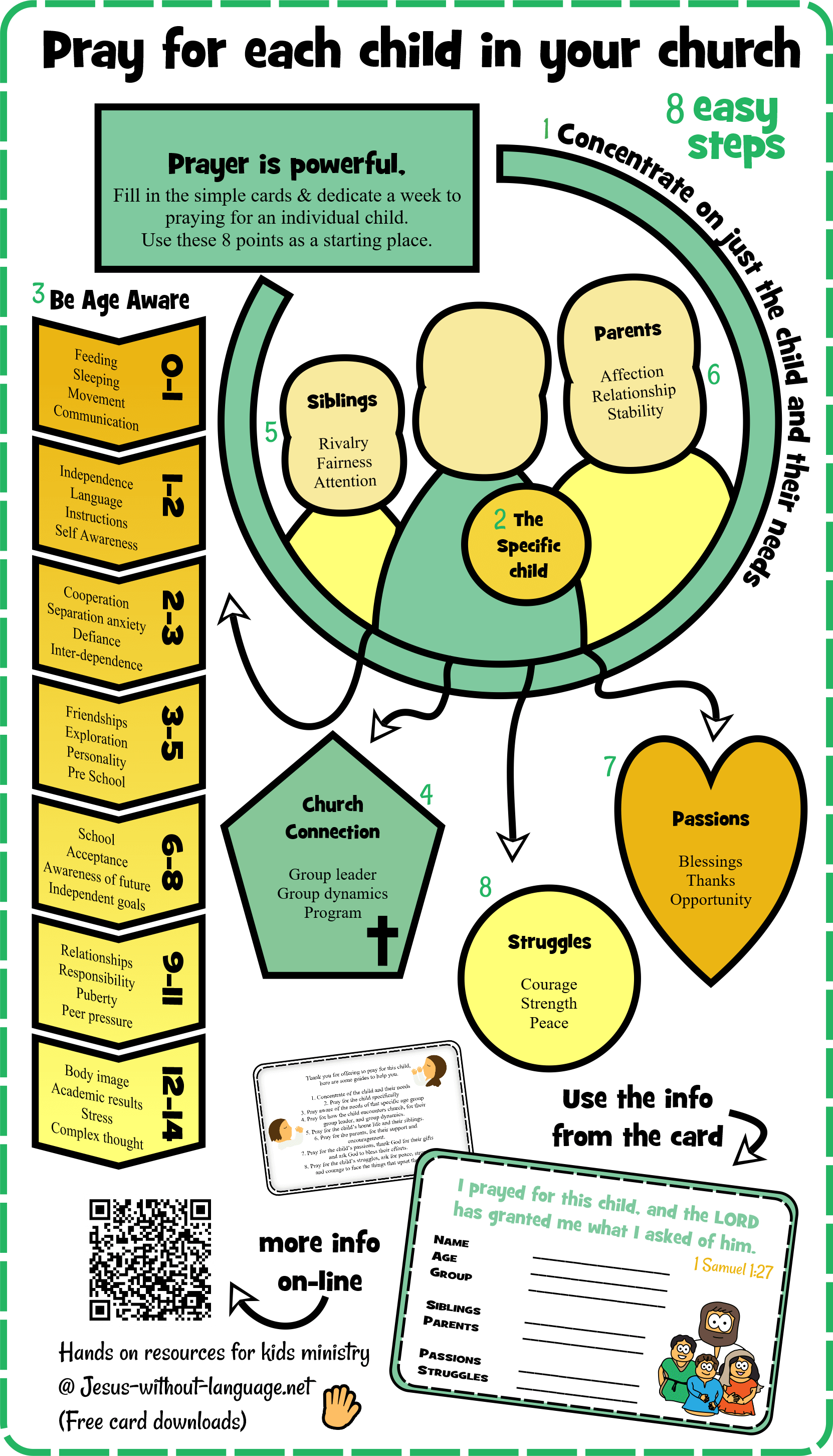 It is important to differentiate between prayer for the young peoples ministry, and prayer for the specific young people. I have found that often the former is much more widely prayed for than the latter. This little card is an easy way to ask specific adults to pray. In the example I have not put the child’s full name, it is designed to be filled as much as is needed and nothing more, the child’s name could be just a letter. Print the cards any size you wish, the back of the cards is a summery of the 8 steps if you wish to print it.