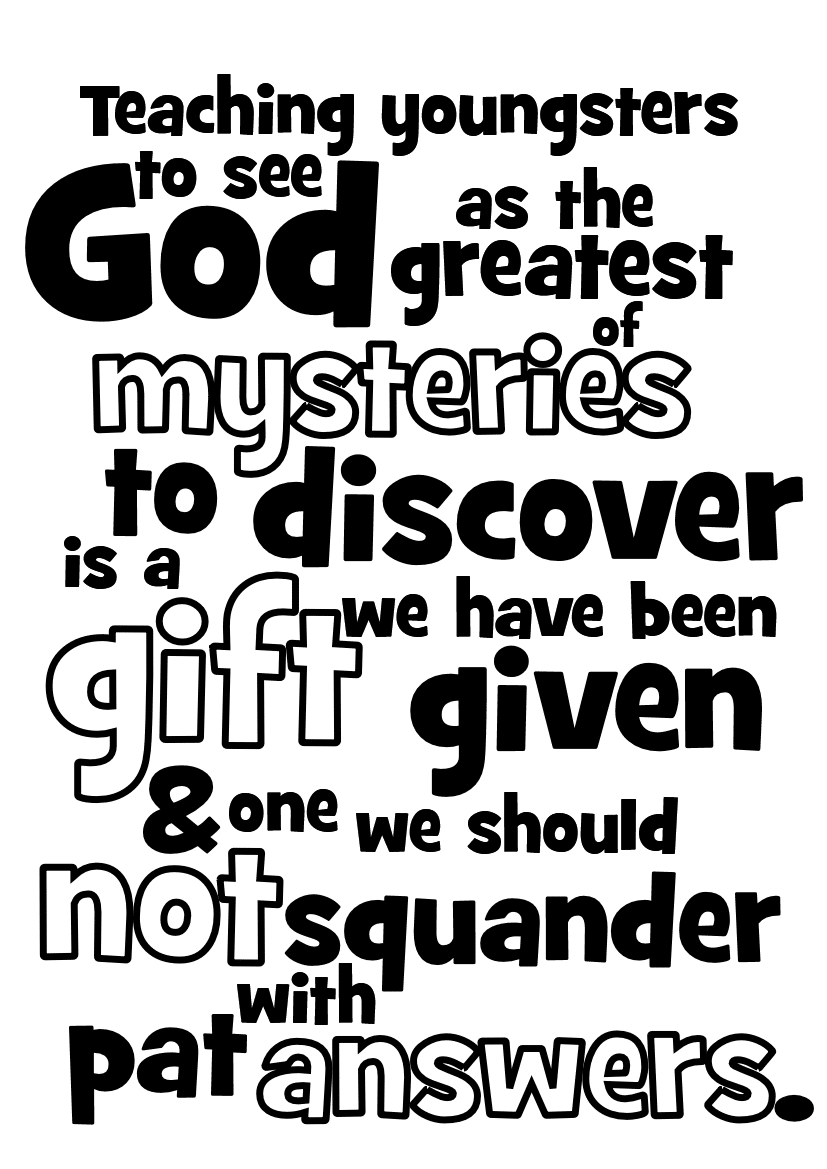 It’s tough not knowing the answers and it’s tough admitting it. It makes us sound weak, foolish and uneducated, but pat answers are just as bad. We are blessed to be in relationship with a God too big for answers but willing to make himself small enough for us to ask. We should not be afraid of the words ‘I don’t know‘, because you can always follow them with ‘God is a mystery, faith is believing even when you can’t find the answers, because you know enough answers to not need to know them all.’ Teaching youngsters to see God as the greatest of mysteries to discover, is a gift we have been given and one we should not squander with pat answers.