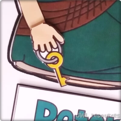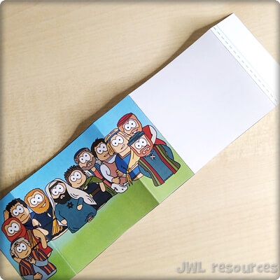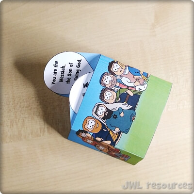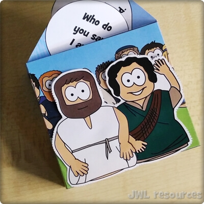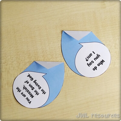 The passage rotates around a simple question and answer. Jesus asks his followers, and Simon-Peter answers. This sliding mechanism is a firm favourite, once you’ve figured out how to add the tabs it’s quick and suits groups that want to colour their own well.