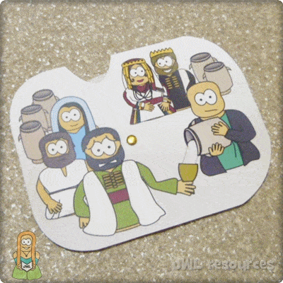 This is a classic craft for an ever popular story. It used a small window and a split pin to show the water changing into wine. When the transformation took place is unknown, but that water was often added to wine is a staple fact of the time and region. This craft is quick and simple to do, it’s also a good craft for younger groups and the cutting is very forgiving – though I’d recommend preparing by removing the window in advance.