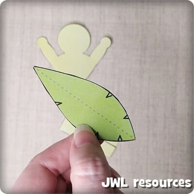 Fold the leaf in half along the dotted line and glue the leaf to a hand.