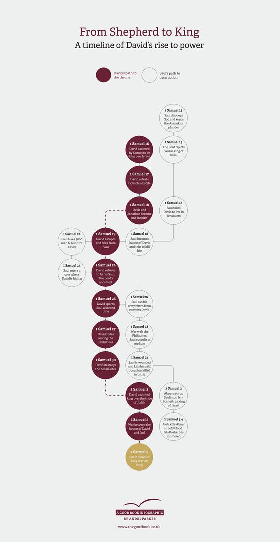 Then the passage ends, leaving us thinking that Saul had come to love David, to give him a permanent position… but that’s not the case. The next chapter starts and David is back to being a shepherd and when David fights the Goliath Saul is unsure of his identity. It’s a point of contention, some claim David would have been brought into a darkened tent with a confused king, too deluded to really comprehend the musician, others argue the early stories of David are by no means in chronological order. More simple arguments wonder if David had aged and would look different from a distance, perhaps Saul had grown tired of David’s songs of a God who had abandoned the king, perhaps the evil spirit had calmed and David was called upon less frequently of late. Whatever the reason Saul and David are not so close as chapter 16 alone may lead one to believe.